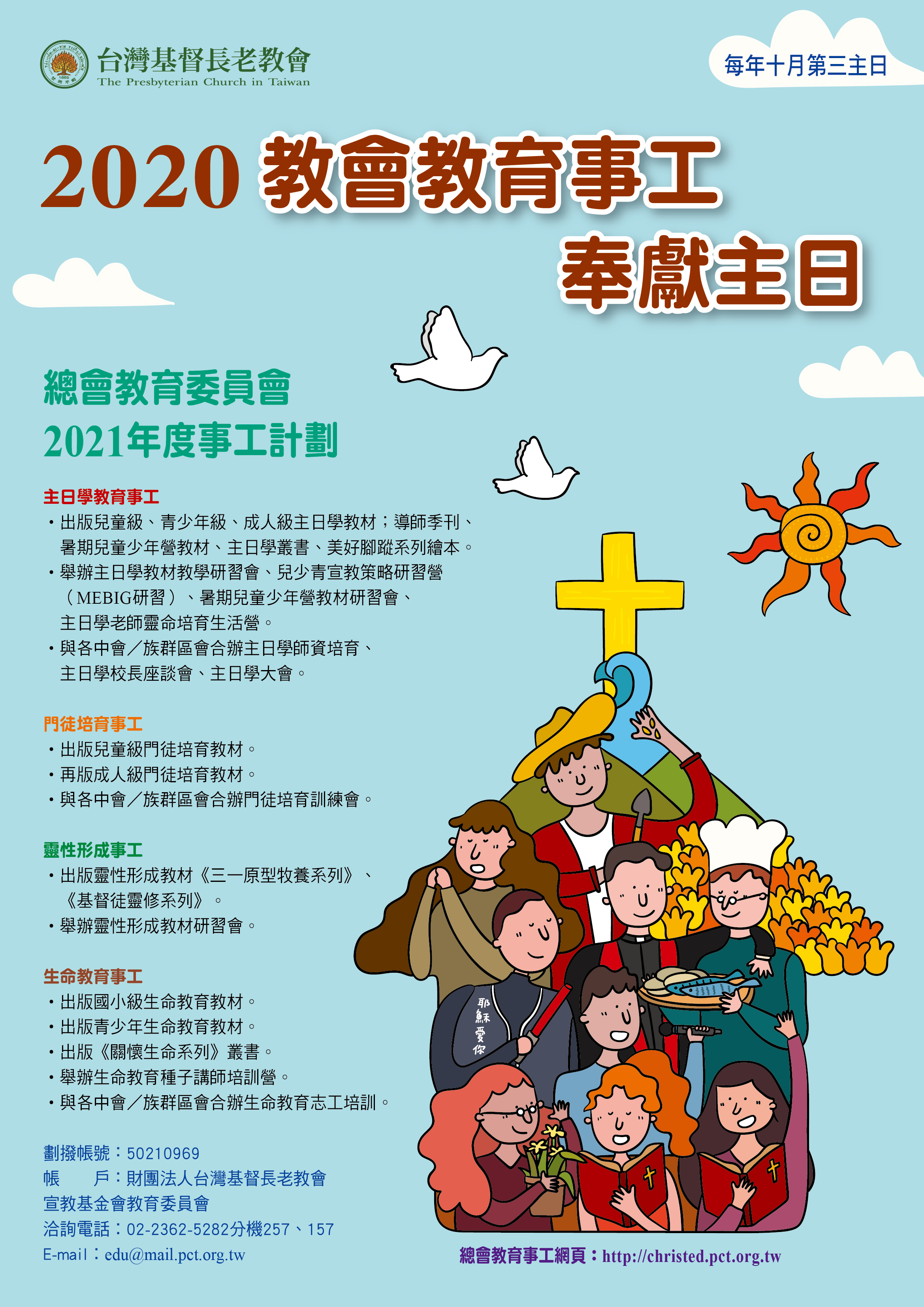 敬愛的主內牧長、兄姐平安: 每年十月第三主日(今年是10月18日)是總會所訂「教會教育事工奉獻主日」。感謝上帝的恩典,眷顧保守我教會教育事工。總會教育委員會於未來年度事工計畫中,將持續推動主日學教育事工、門徒培育事工、靈性形成事工與生命教育事工。敬請各位牧長藉著「教會教育事工奉獻主日」在各中會/族群區會內交換講台,並於禮拜中向各教會兄姐請安與報告。 2021年度總會教育委員會事工計劃如下: 一、主日學教育事工 1. 教材出版:兒童級、青少年級、成人級主日學教材;導師季刊、暑期兒童少年營教材、主日學叢書、美好腳蹤系列繪本。 2. 培育活動:主日學教材教學研習會、兒少青宣教策略研習營(MEBIG研習)、暑期兒童少年營教材研習會、主日學老師靈命培育生活營。 3. 與各中會/族群區會合辦主日學師資培育、主日學校長座談會、主日學大會。 二、門徒培育事工 1. 出版兒童級門徒培育教材、再版成人級門徒培育教材。 2. 與各中會/族群區會合辦門徒培育訓練會。 三、靈性形成事工 1. 出版靈性形成教材《三一原型牧養系列》、《基督徒靈修系列》。 2. 舉辦靈性形成教材研習會。 四、生命教育事工 1. 出版國小級生命教育教材、青少年生命教育教材。 2. 出版《關懷生命系列》叢書。 3. 舉辦生命教育種子講師培訓營。 4. 與各中會/族群區會合辦生命教育志工培訓。 在此謹向眾教會牧長及所有參與教育的老師、同工表達感謝,因為您默默地付出與奉獻,讓信仰教育一代接一代,持續成長茁壯,願上帝親自紀念您的辛勞。 台灣基督長老教會總會教育委員會 主委 朱忠宏 幹事 李位鼎