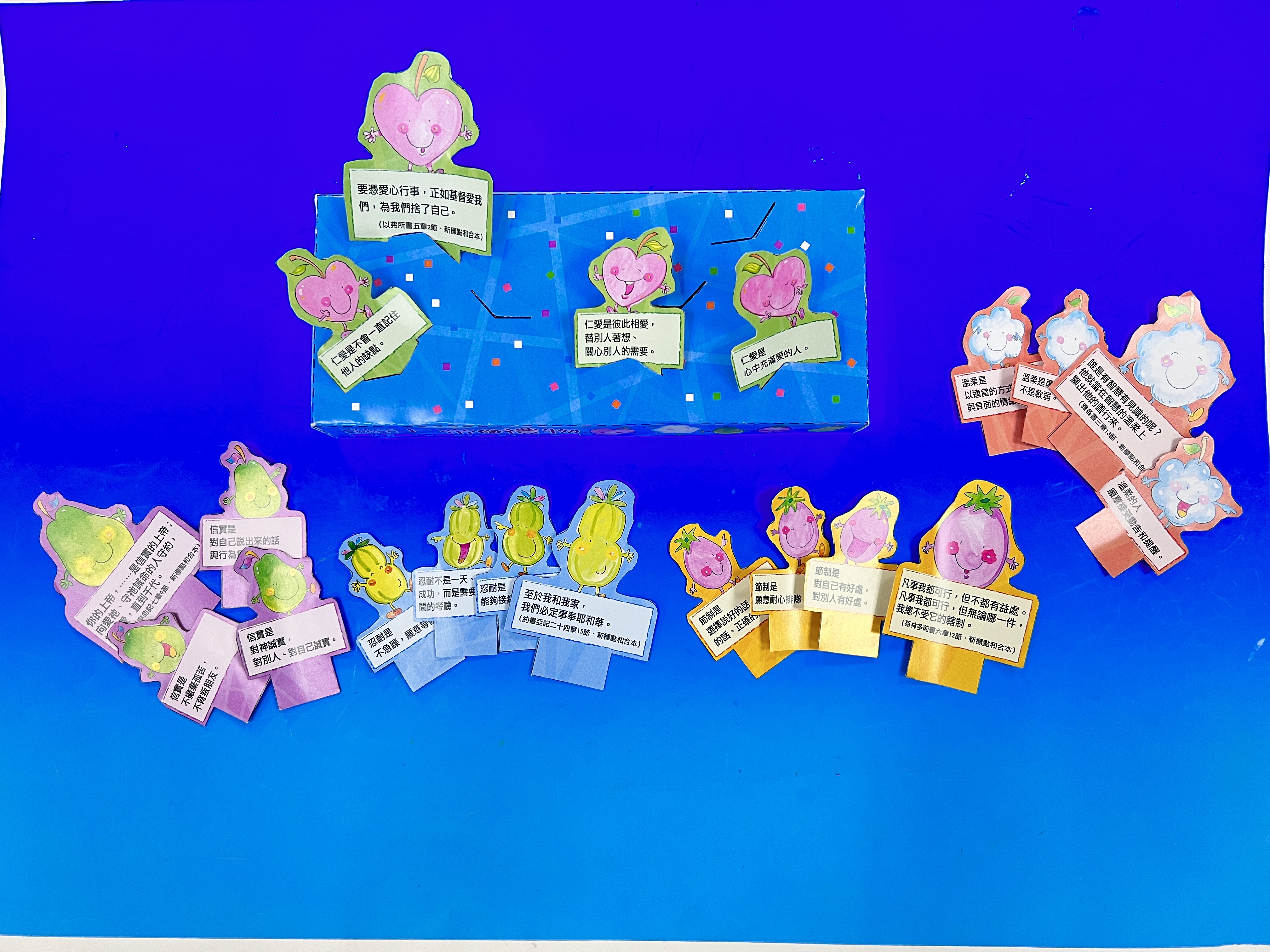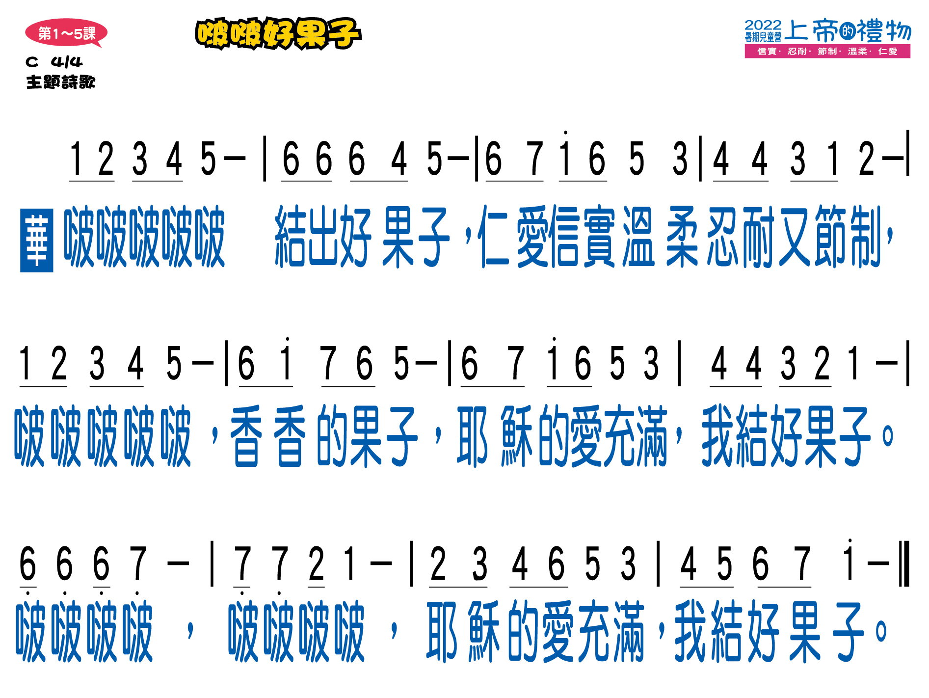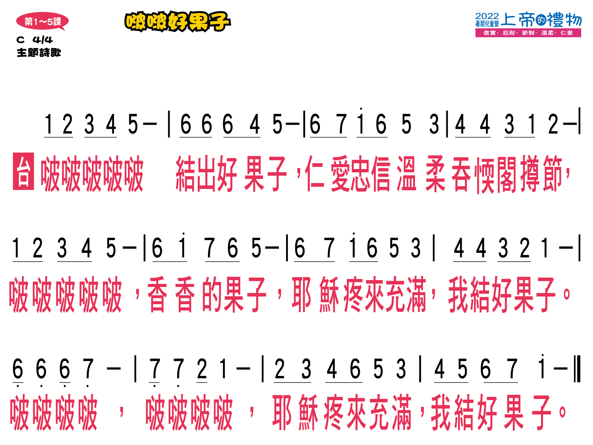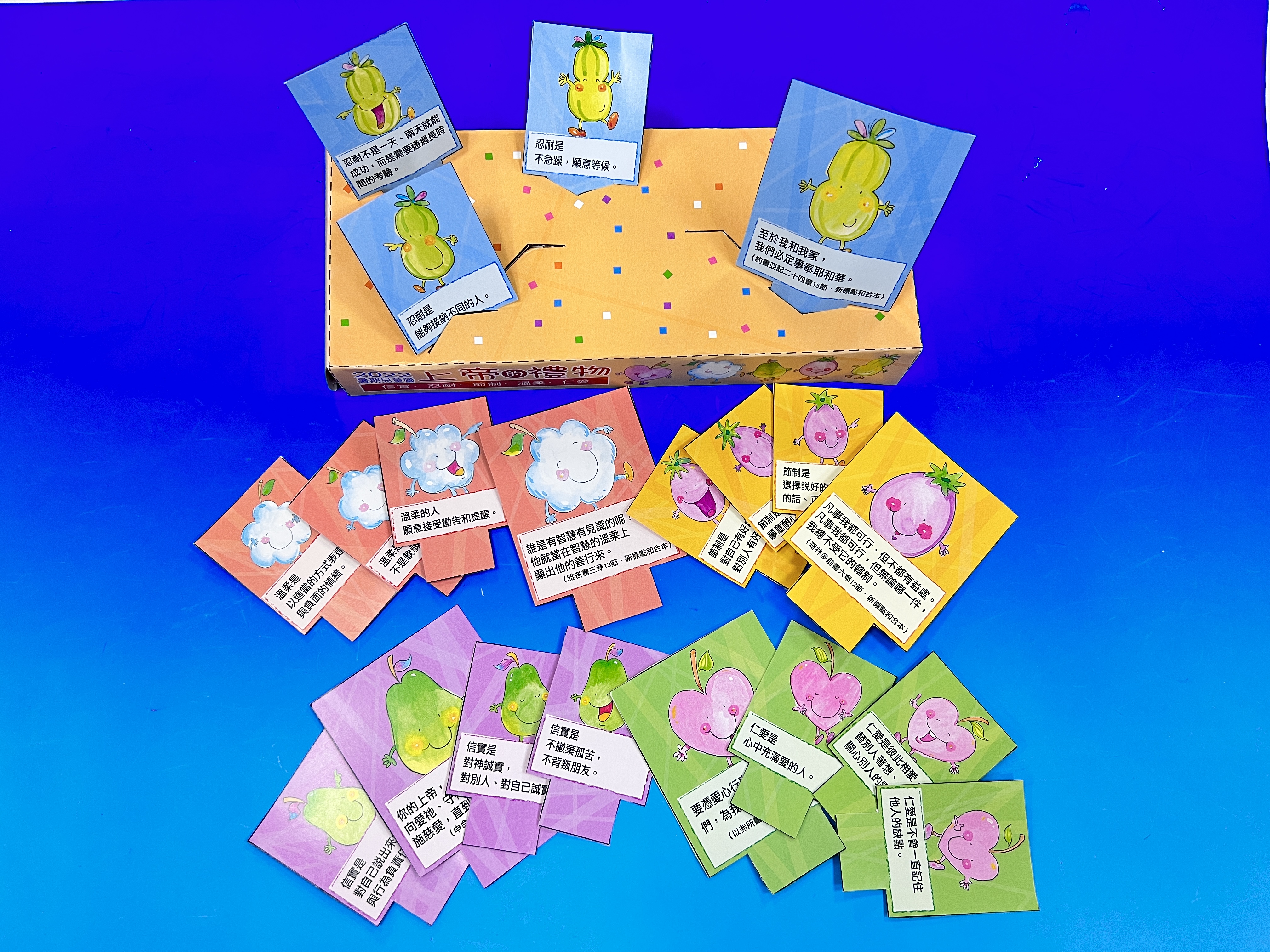 | 今年暑期兒童營將上帝所賜的禮物─聖靈果子(加拉太書五22~23)中的「信實、忍耐、節制、溫柔、仁愛」等五個特質,並以「上帝的禮物」為題。透過五位聖經人物來分享各特質的重要性,讓每個孩子在生活上、信仰裡都結出信實、忍耐、節制、溫柔、仁愛的好果子!