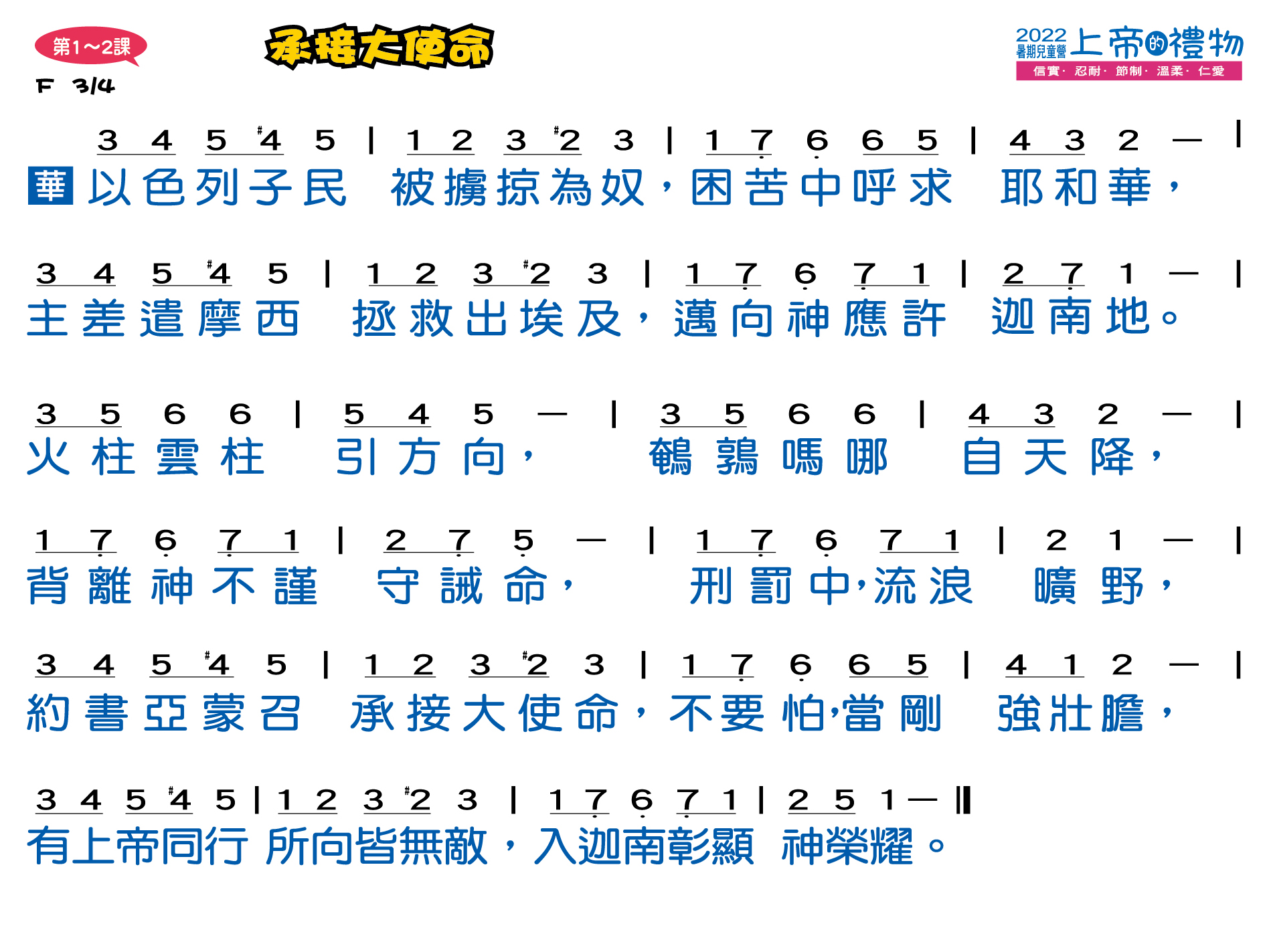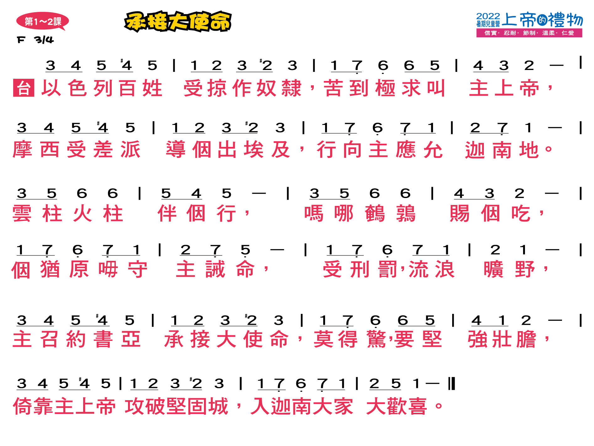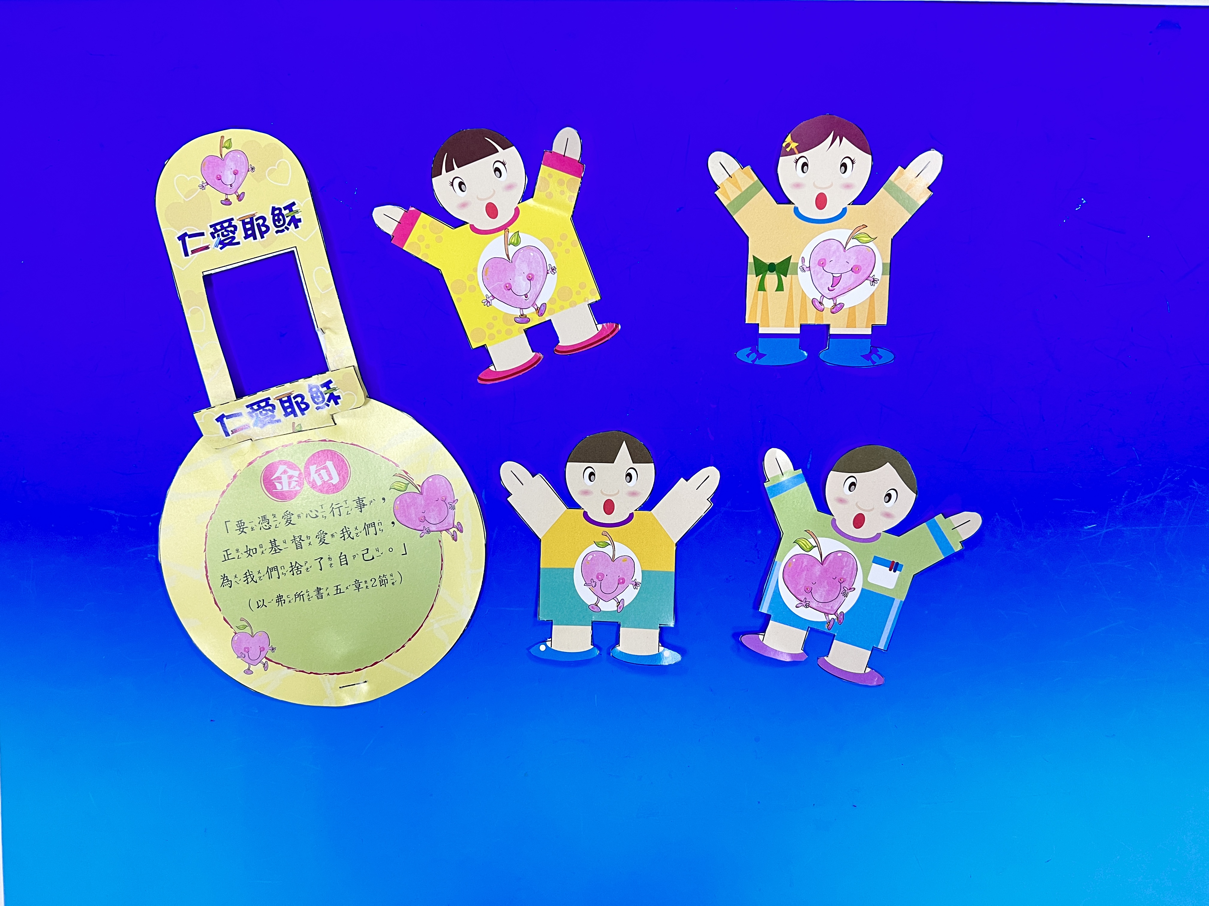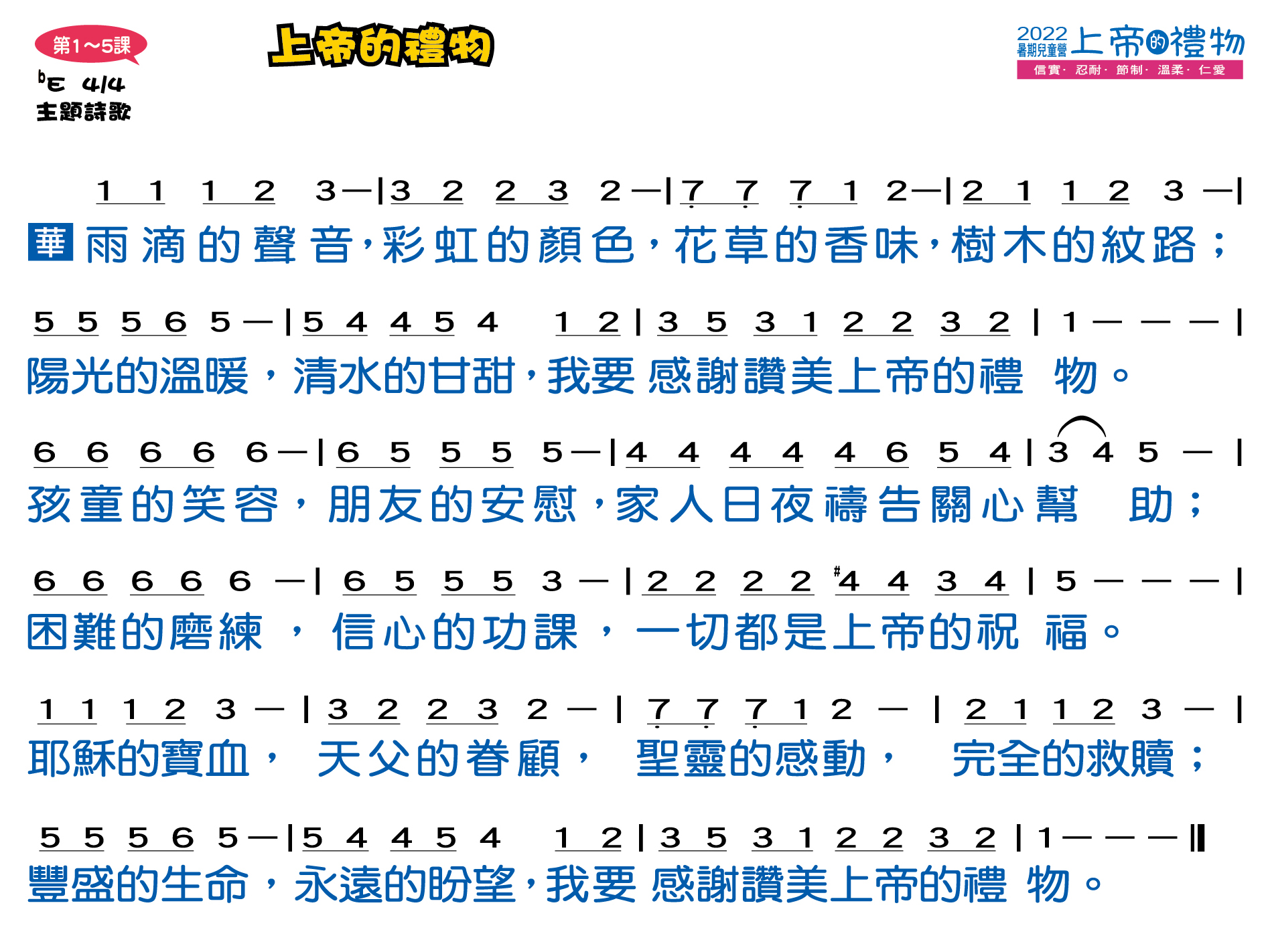 | 今年暑期兒童營將上帝所賜的禮物─聖靈果子(加拉太書五22~23)中的「信實、忍耐、節制、溫柔、仁愛」等五個特質,並以「上帝的禮物」為題。透過五位聖經人物來分享各特質的重要性,讓每個孩子在生活上、信仰裡都結出信實、忍耐、節制、溫柔、仁愛的好果子!